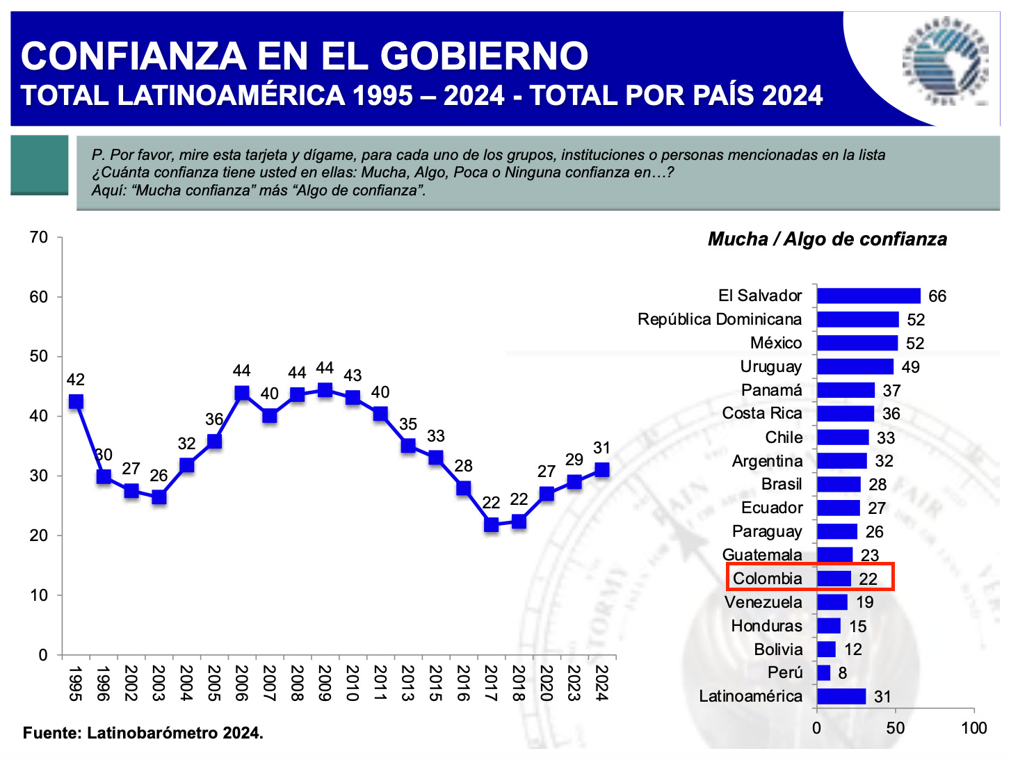 Finally, low levels of institutional trust and a widespread skepticism about large-scale improvement weaken Colombia’s capacity to mobilize collective action. Surveys from Latinobarómetro, the World Values Survey, and OECD trust indicators consistently show low confidence in public institutions. While distrust is often justified by past failures, it also raises resistance to reform, increases litigation, and encourages defensive governance. From a Progress Studies lens, this erosion of confidence reduces society’s willingness to build, experiment, and accept trade-offs—making paralysis more likely than progress.